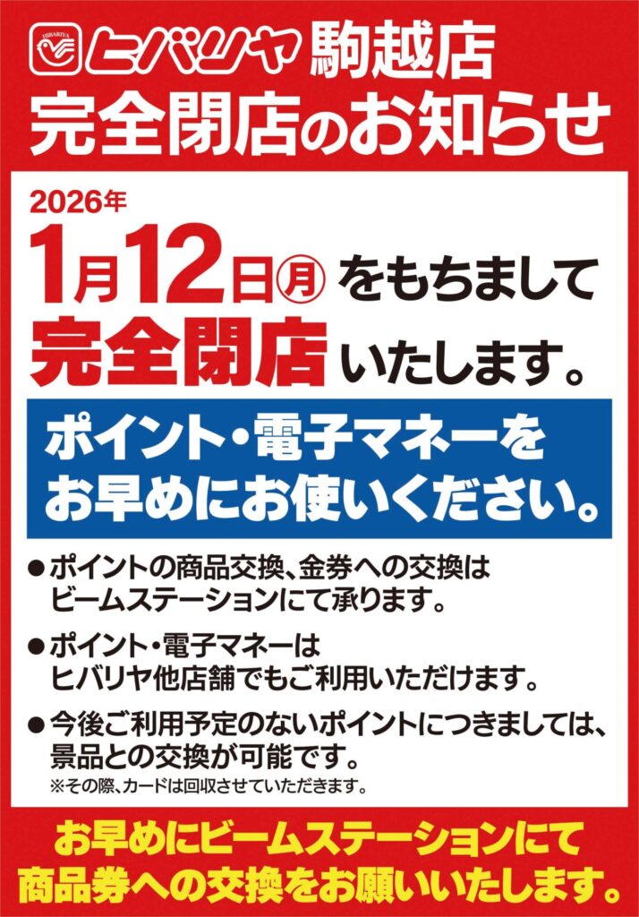 ヒバリヤ駒越BD店は、1月12日をもちまして閉店することとなりました。